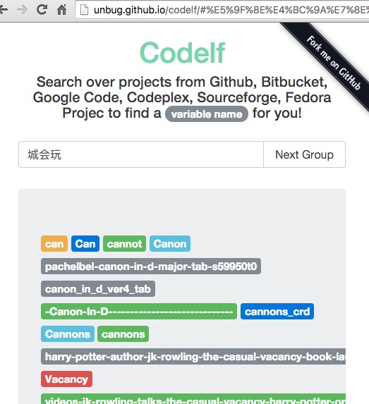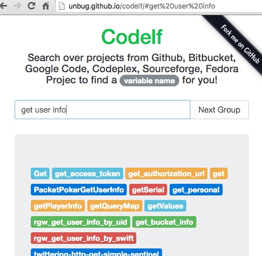 Codelf通過搜索在線開源平臺(tái)Github, Bitbucket, Google Code, Codeplex, Sourceforge, Fedora Projec的項(xiàng)目源碼,幫開發(fā)者從中找出已有的匹配關(guān)鍵字的變量名。這個(gè)搜索服務(wù)支持直接搜索中文。codeif支持中文查詢,輸入中文意思,codeif可以根據(jù)需要查詢盡可能滿足需要的結(jié)果,并展示與查詢結(jié)果相關(guān)的支持各種編程語言的代碼片段以及代碼庫。