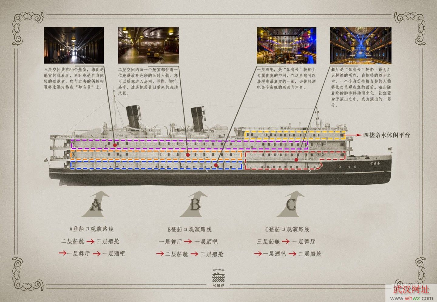 為使游客有更好的觀演體驗(yàn),《知音號(hào)》分為A、B、C三個(gè)登船口進(jìn)入“知音號(hào)”內(nèi),三條路線(xiàn)入口和路線(xiàn)不同但觀看內(nèi)容是相同的。
